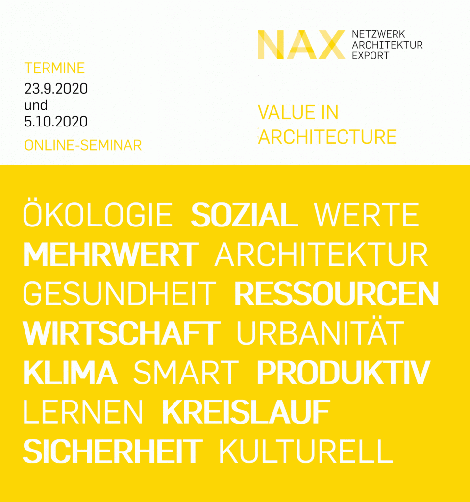 The NAX online seminar “NAX talks about…” takes place from 3:00 to 5:15 p.m. on 23 September and 5 October 2020. Under the title Value in Architecture, this event explores the question of what value and added value is created by architecture.