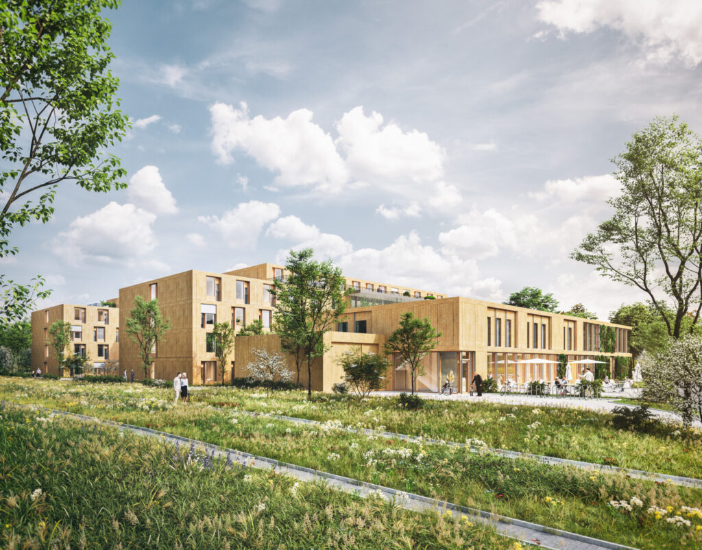 Bei diesem Projekt stand Nachhaltigkeit im Fokus und zeigt sich zunächst ganz direkt in der Holzfassade und Fassadenbegrünung. Tiefe Balkone sorgen für Außenraumbezug und die großzügig verglaste Südfassade lässt viel natürliches Tageslicht in den Innenraum. Die Balkone werden durch Kletterpflanzen begrünt, die das Mikroklima und Aufenthaltsqualität weiter verbessern.