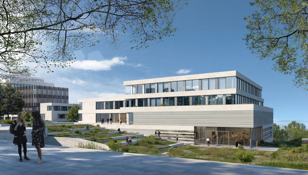 Der Neubau ist Teil der Neugestaltung der „Neuen Mitte“ des Campus und soll den wissenschaftlichen Austausch fördern. Es wird nach dem Passivhausstandard errichtet und erhält unter anderem eine Photovoltaikanlage mit einer Leistung von rund 147 Kilowatt Peak.